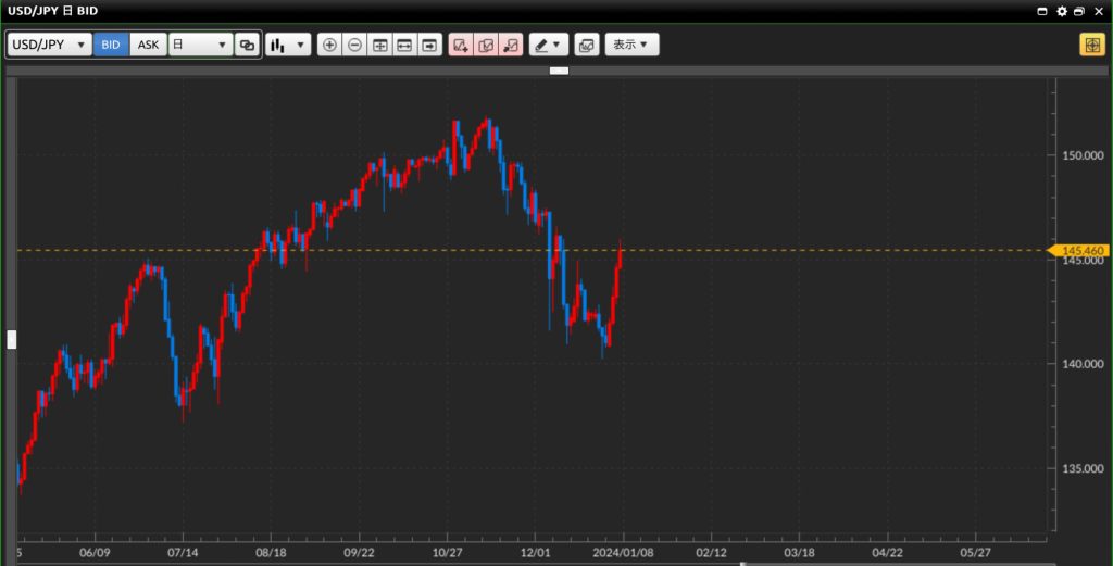 そう考えると、期待値を含め2024年3月頃までには円高にシフトし始めるでしょうから、今から戻り高値をつけたあたりから、ショートを打っておくのもいい作戦になるのではないでしょうか。