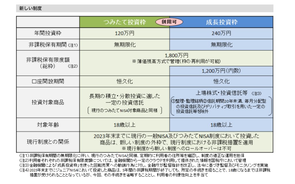 - 年間投資枠の拡大(つみたて投資枠:年間120万円、成長投資枠:年間240万円、合計最大年間360万円まで投資が可能。)